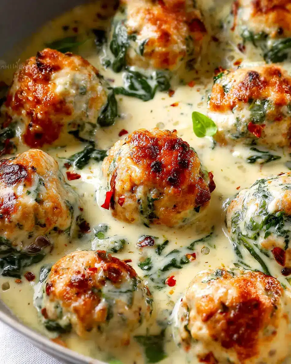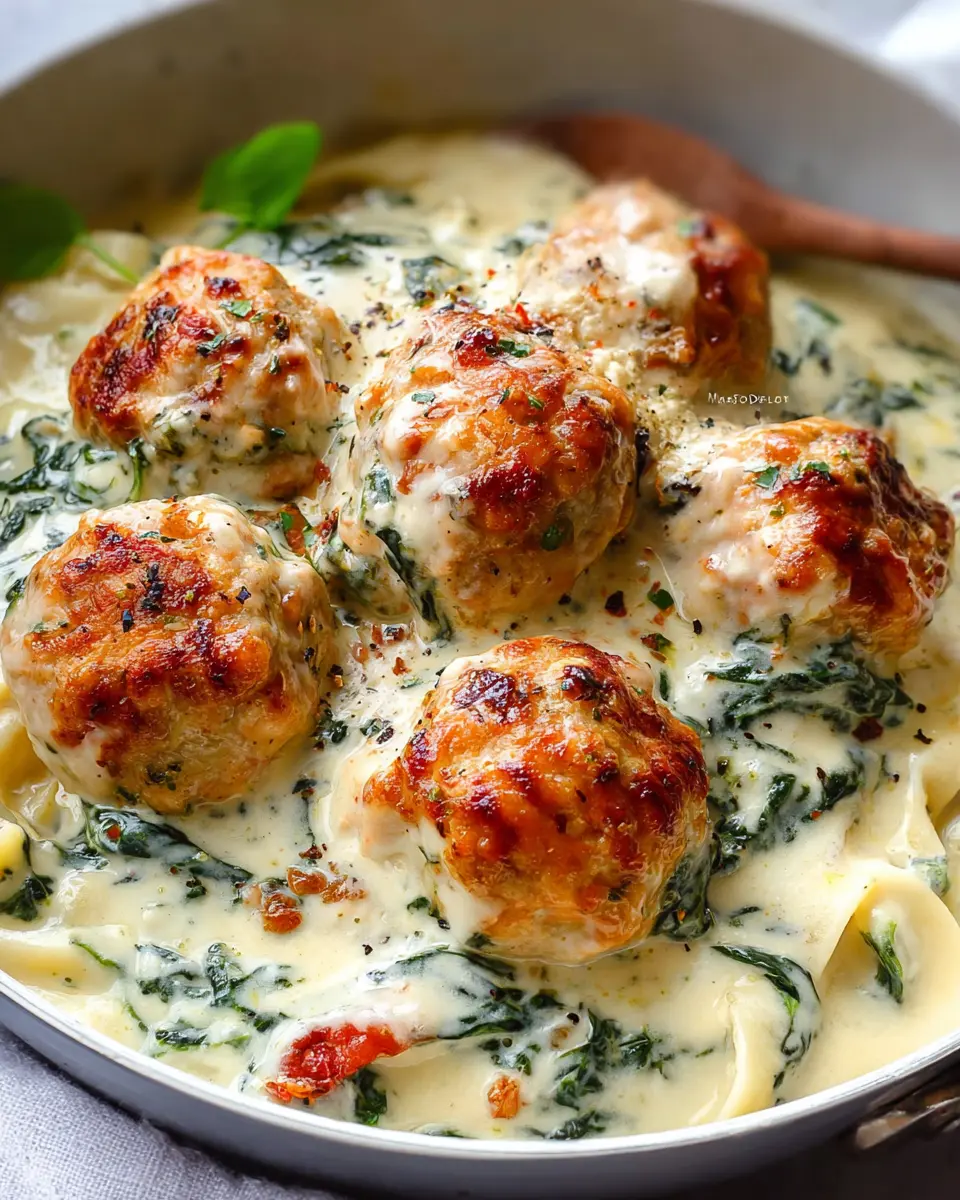 Baked Chicken Ricotta Meatballs with Spinach Alfredo Sauce