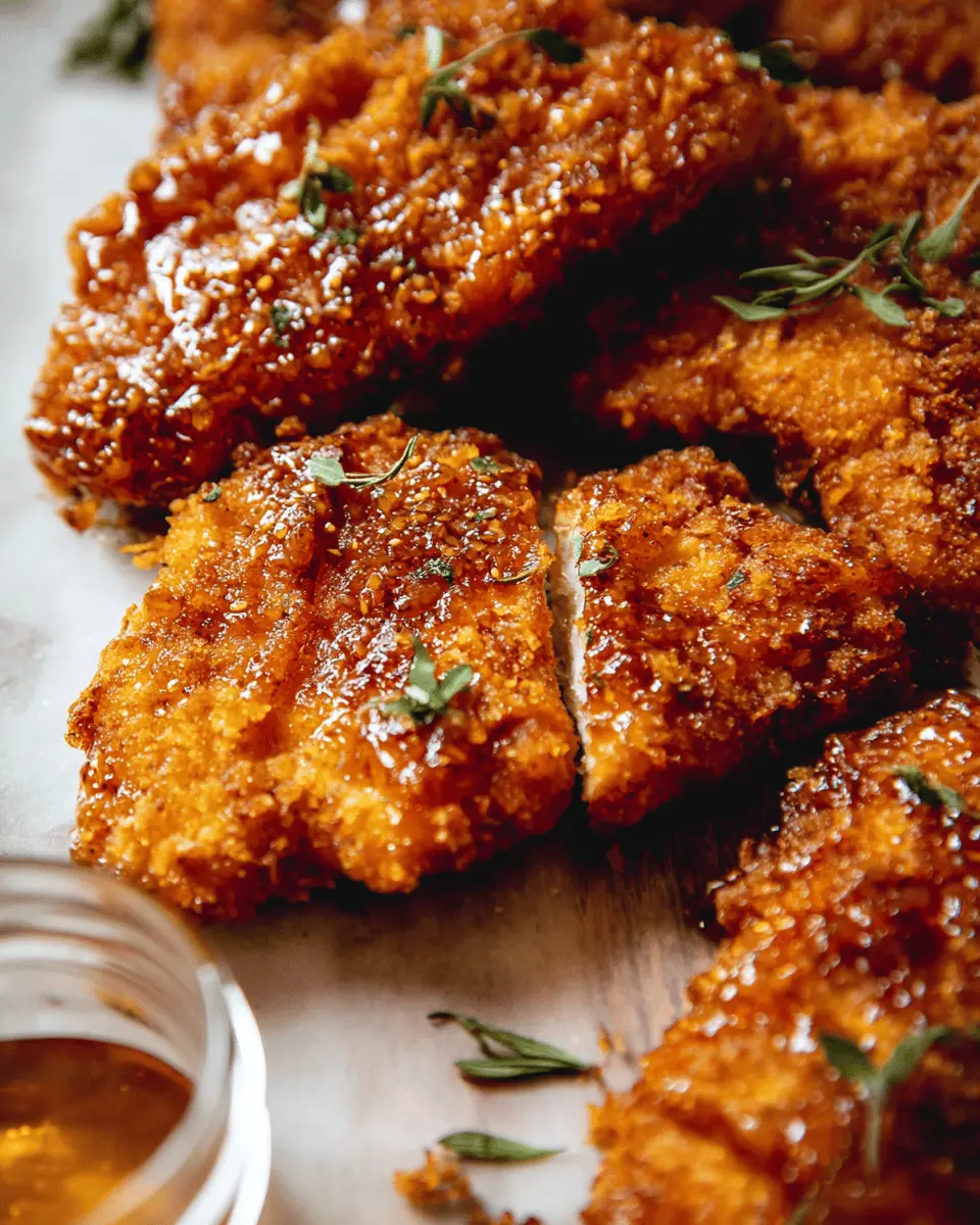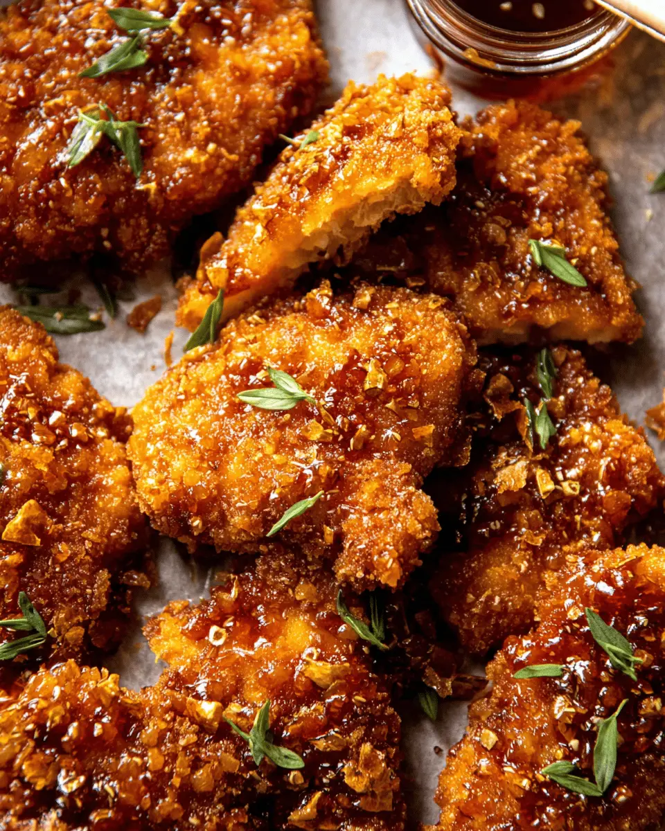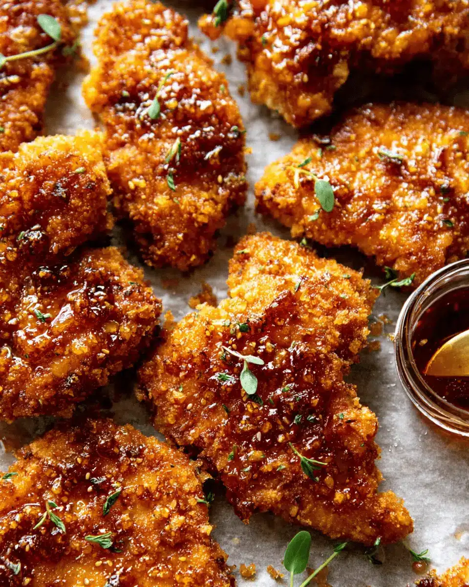 To achieve that irresistible crunch in your baked crunchy hot honey chicken, make sure to coat the chicken tenderloins thoroughly with the cornflake mixture. For an extra crispy finish, consider double-dipping: dip the chicken in the egg mixture, coat it in the crumb mix, and then dip again before baking. Drizzle a little extra virgin olive oil before popping it in the oven to enhance the crispiness, and always use a baking sheet lined with parchment paper to prevent sticking.