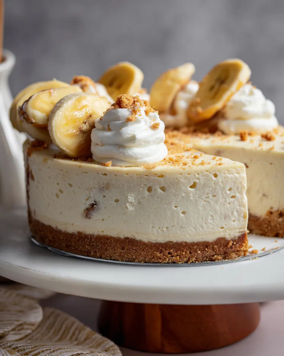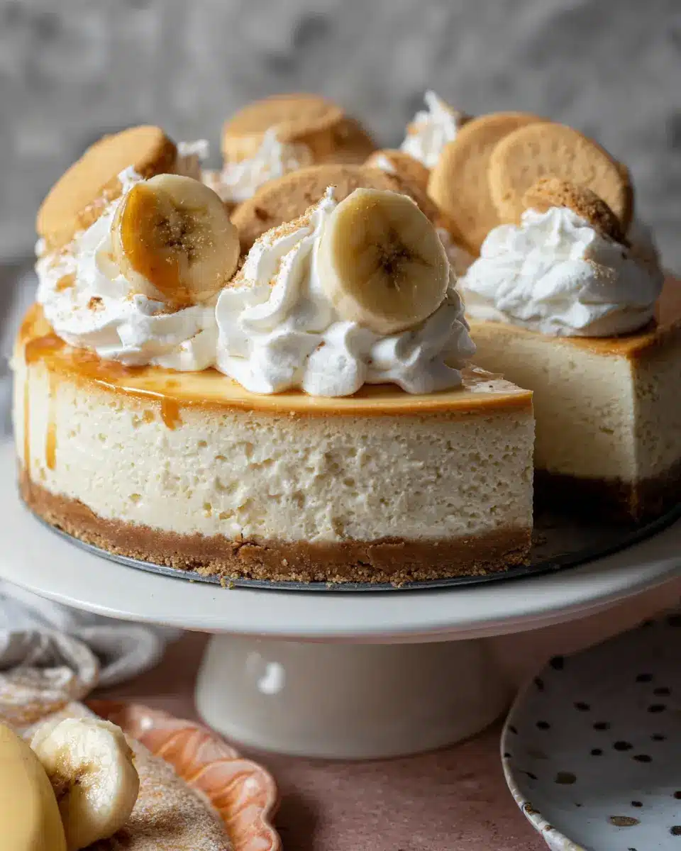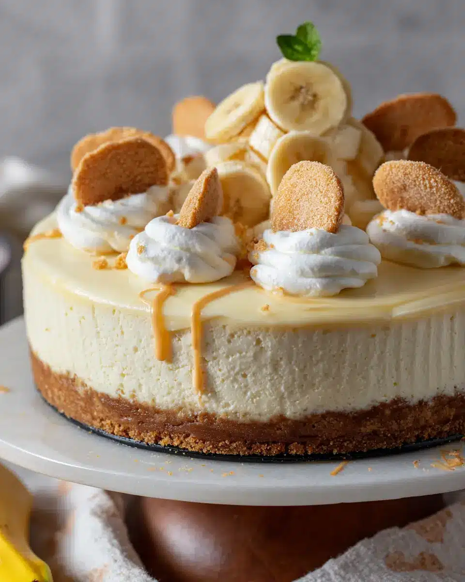 Once cooled, carefully transfer the cheesecake to a wire rack to cool completely. Cover it tightly and let it chill in the refrigerator for at least 5-6 hours, or overnight if you’re feeling patient—this waiting time allows flavors to meld beautifully. When you’re ready to serve, loosen it from the pan using a thin knife, then decorate with whipped cream, fresh banana slices, and Nilla wafers!