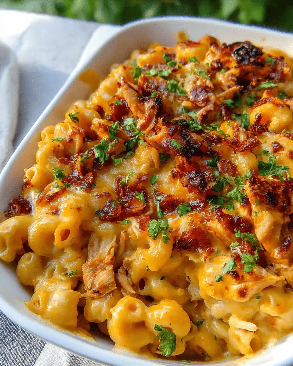 Elevate your BBQ Chicken Mac and Cheese by adding a sprinkle of chopped cilantro or green onions for a burst of color and freshness. For added texture, consider topping it with crispy turkey bacon bits or a drizzle of extra barbecue sauce. Serve it in a rustic cast-iron skillet or in individual ramekins for an inviting presentation. Don’t forget to pair it with a side of pickles to cut through the richness!