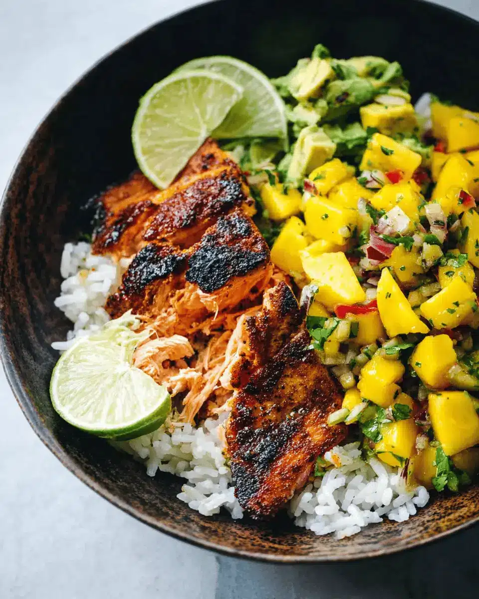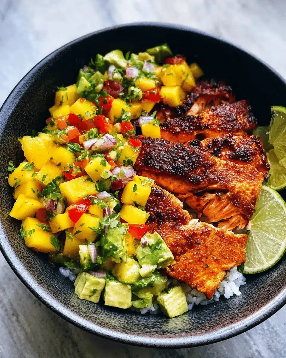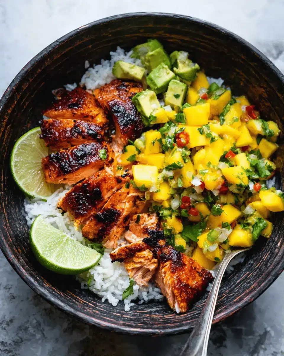 BBQ Salmon Bowls with Mango Avocado Salsa