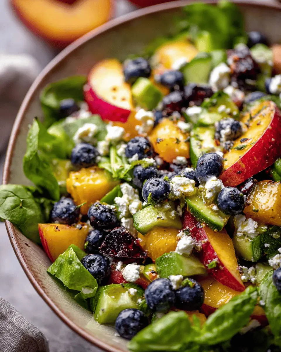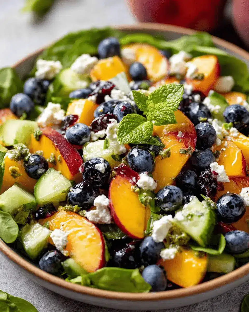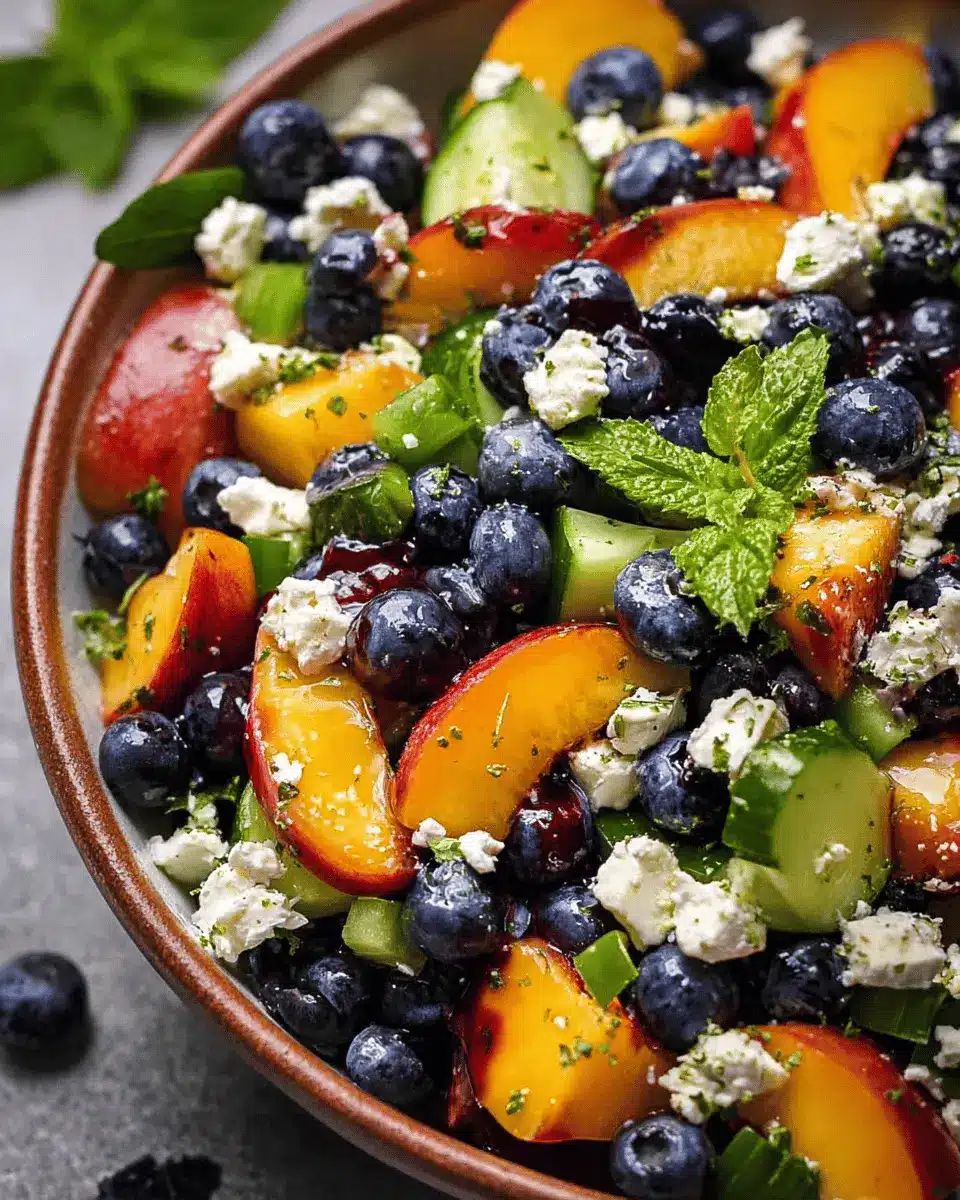 In a large serving bowl, combine the blueberries, diced peaches, sliced cucumbers, and crumbled feta. The vibrant colors of this salad will instantly lift your spirits. The combination of juicy peaches and tart blueberries creates a delightful contrast, while the feta adds a salty creaminess that perfectly rounds it all off.