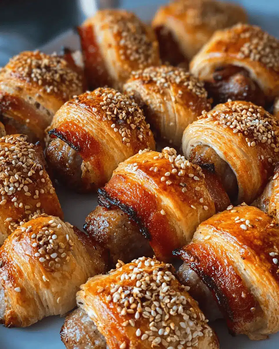 Elevate your Breakfast Pigs in a Blanket with an everything bagel twist! By brushing the dough with an egg wash and sprinkling it with a flavorful blend of sesame seeds, poppy seeds, garlic powder, and onion flakes, you create a delightful crunchy topping that complements the savory sausage perfectly. Serve these at brunch, and watch as your friends devour them in no time!