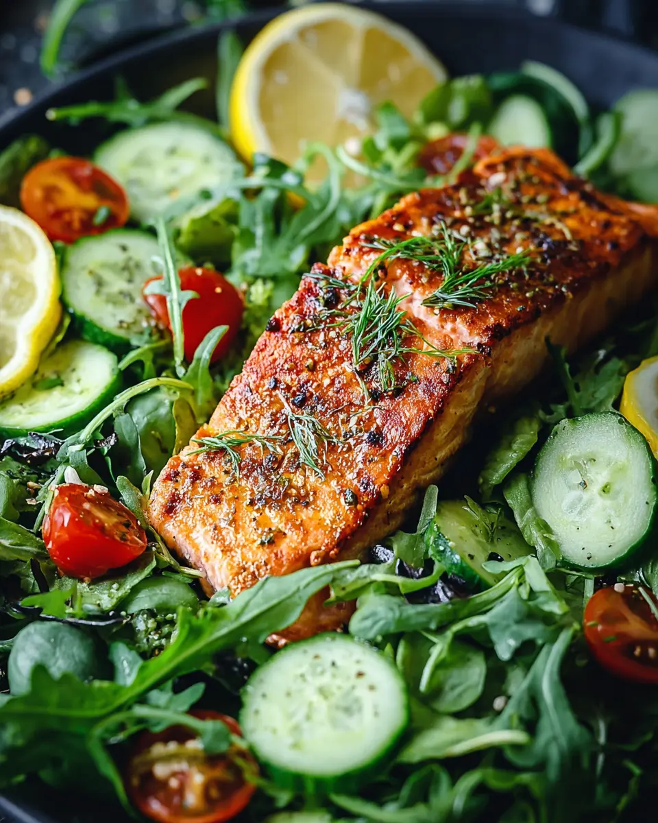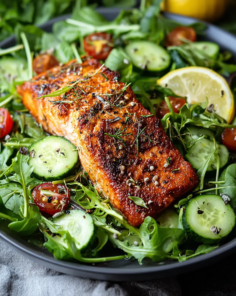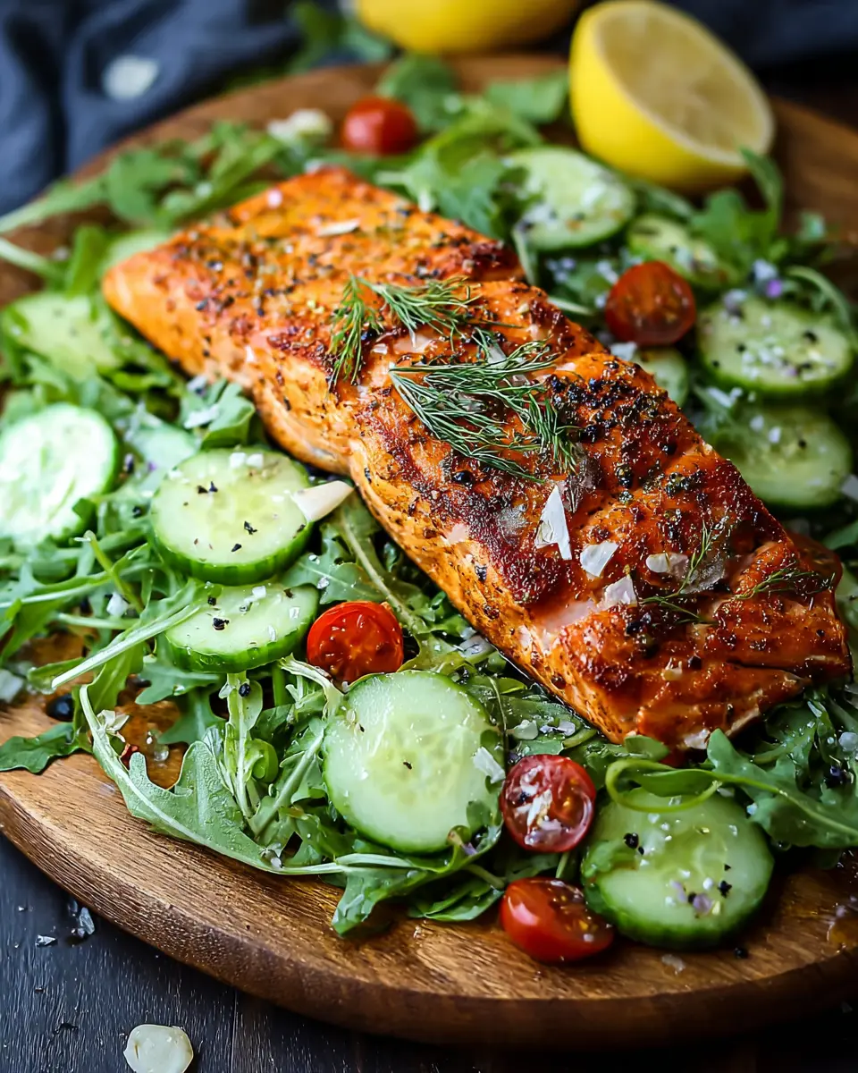 Citrus Oven Baked Salmon over Arugula Cucumber Salad Bliss