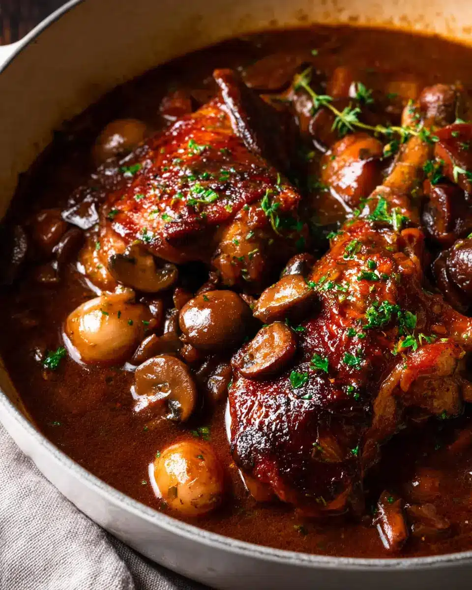 - Charcuterie style: Create a Coq au Vin platter featuring small bowls of the stew, accompanied by turkey bacon, olives, and artisanal cheeses.