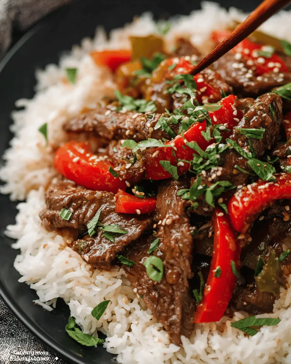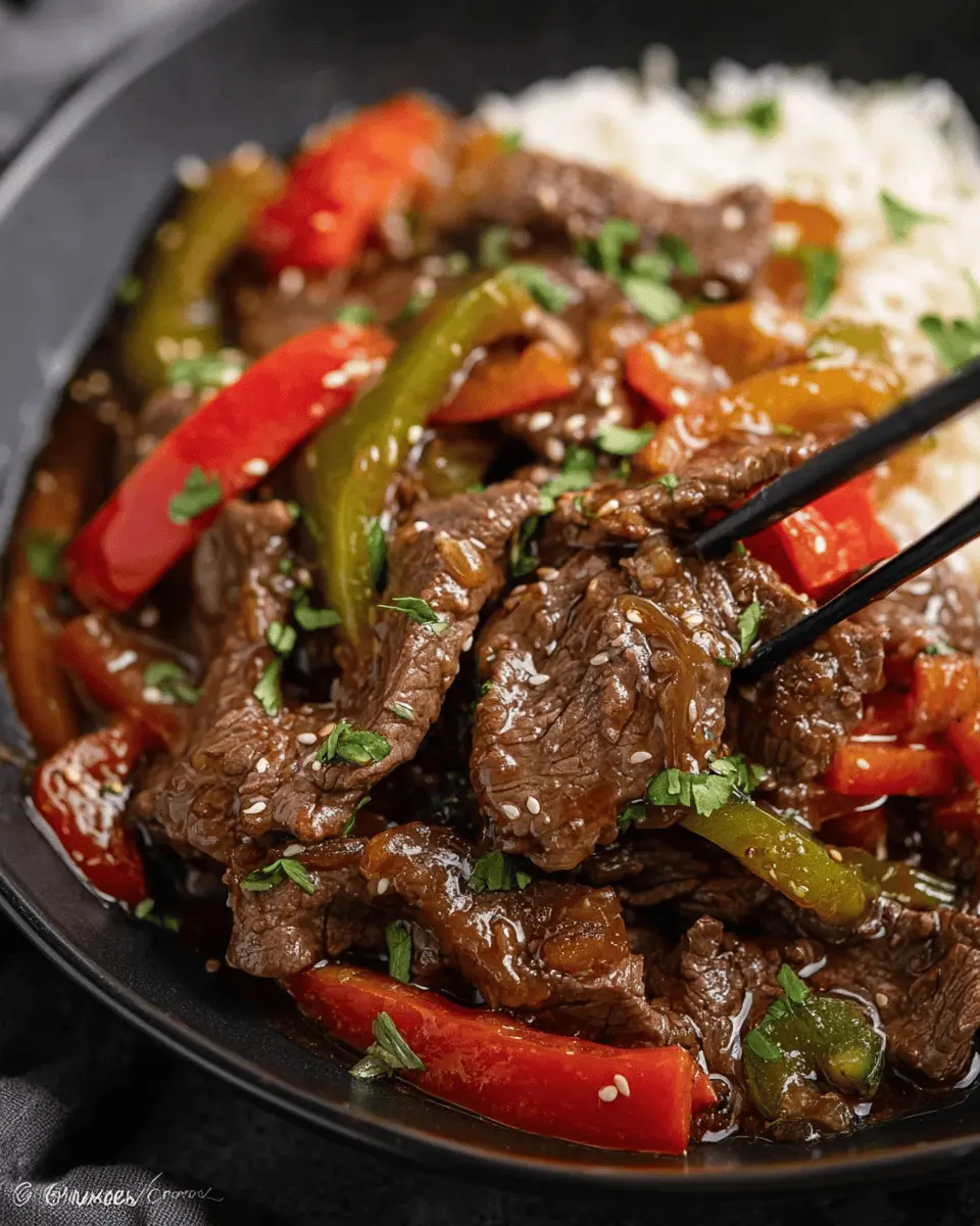 Go beyond the basics by getting creative with how you present your easy crockpot pepper steak. Try serving it in: