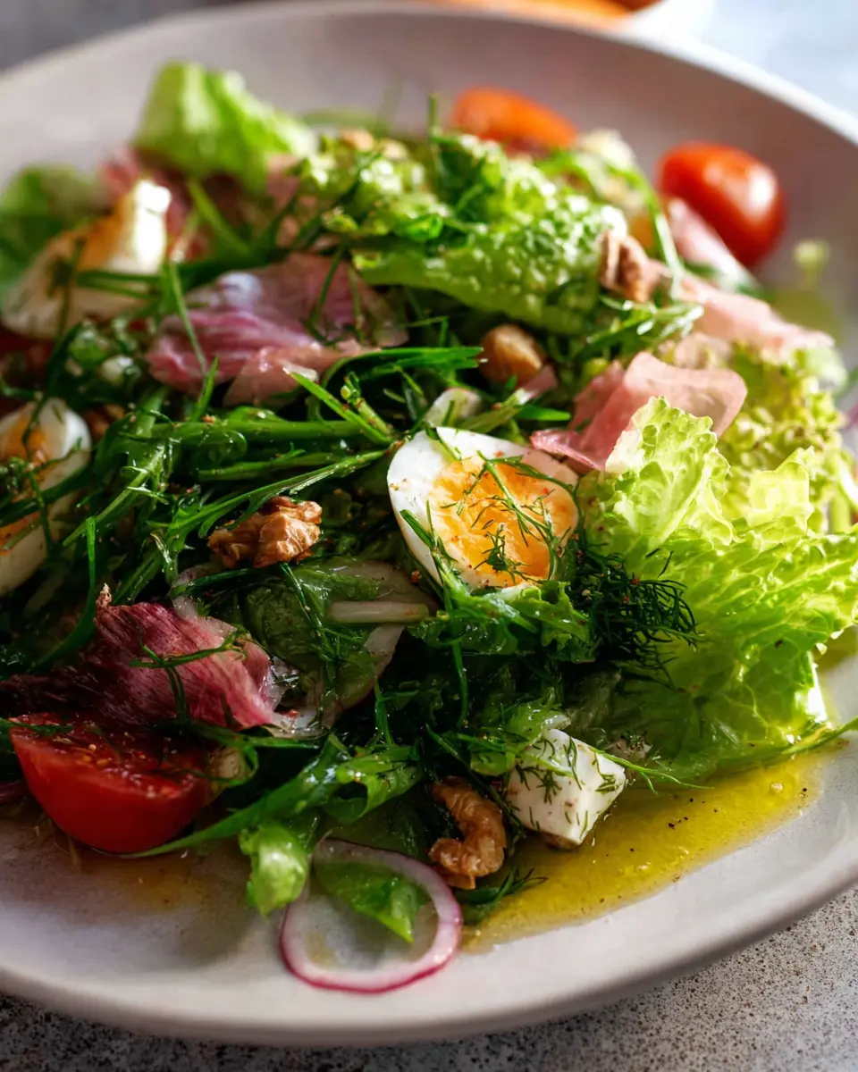 Now, it’s time for the fun part: assembling your French Bistro Salad! On a large platter, pile the prepared lettuce leaves. Drizzle about half of your dressing over the greens and toss them gently with your hands to ensure every leaf gets a touch of that delicious flavor. Next, scatter the freshly chopped tarragon, chives, and parsley over the top, followed by the pickled eschalots. If you’re feeling fancy, sprinkle some toasted walnuts for a delightful crunch. Drizzle a bit more dressing on top for good measure—because who doesn’t love extra flavor?