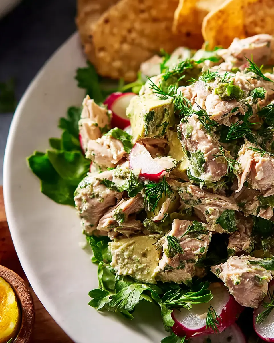 To finish off your Green Goddess Tuna Salad, add a sprinkle of additional herbs or a light dusting of pepper on top. It adds a nice touch and makes the dish visually appealing. Serve your salad on a bed of greens, in a sandwich, or alongside whole-grain crackers for a delightful lunch or dinner option.