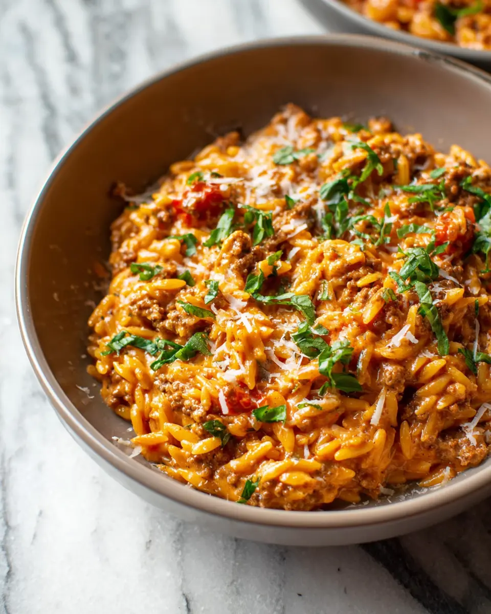 If you like a heartier ground beef orzo, simmer longer to reduce the sauce further. Prefer a creamier, soup-like consistency? Simply add more beef broth or cream until you reach your desired thickness. Remember, you can always fine-tune the texture right before serving! A sprinkle of freshly grated Parmesan as you serve can also enhance both flavor and richness.