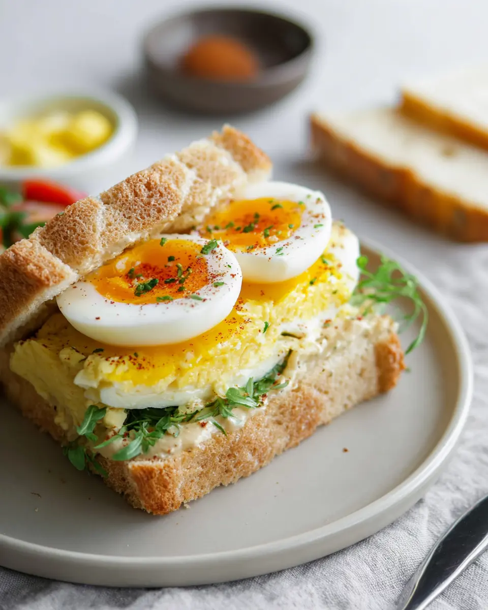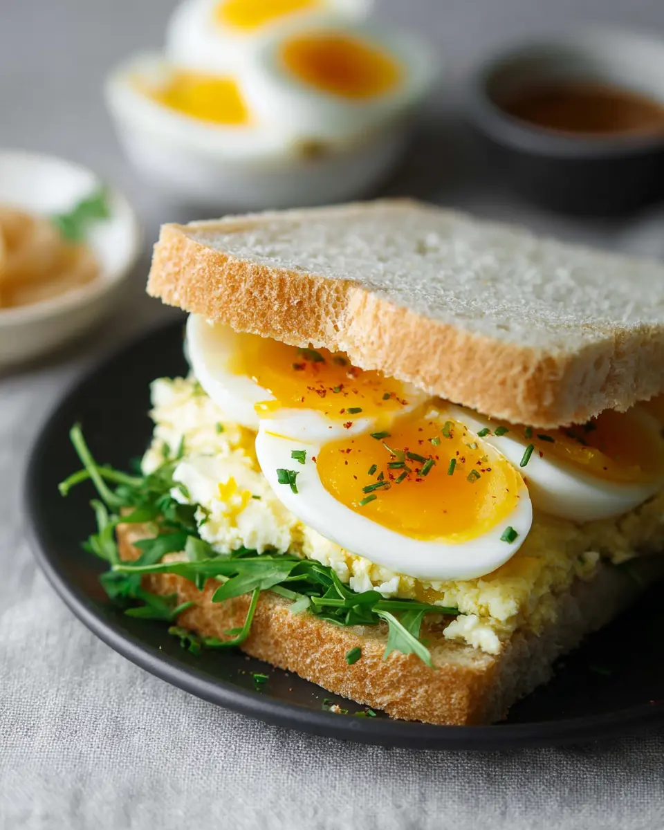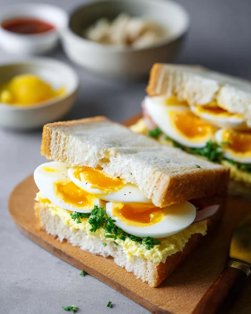 - Carefully slice each sandwich in half, exposing the creamy filling and that beautiful medium-boiled egg.