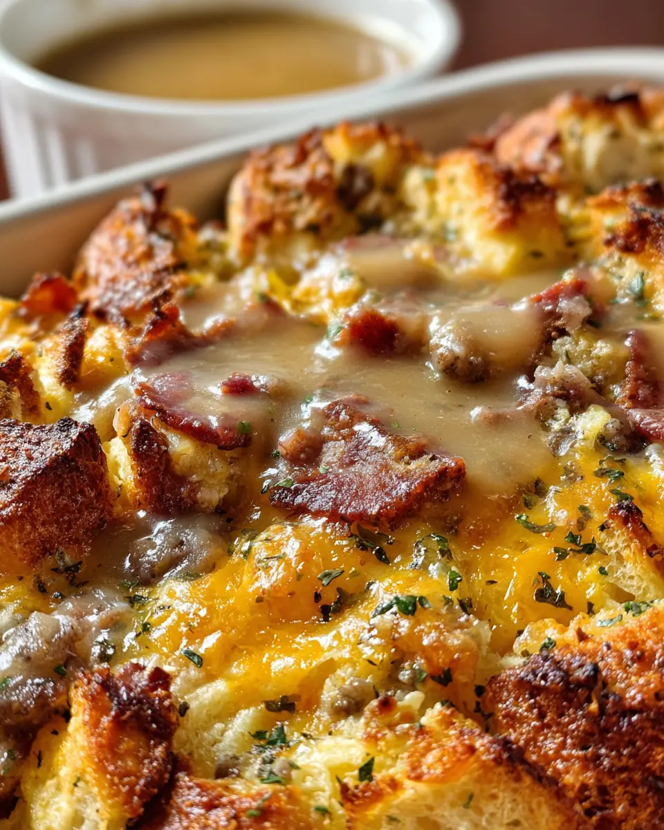 The next morning, preheat your oven to 350°F (175°C). Remove the casserole from the fridge, uncover it, and bake for about 45-50 minutes, or until golden brown and set in the middle. Serve warm with that creamy homemade gravy drizzled on top.