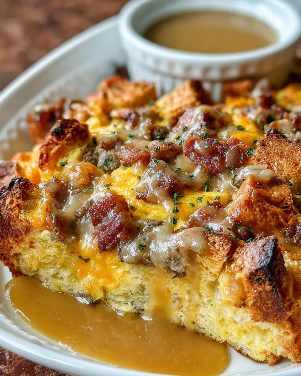 Overnight Croissant Breakfast Casserole Bake with Gravy