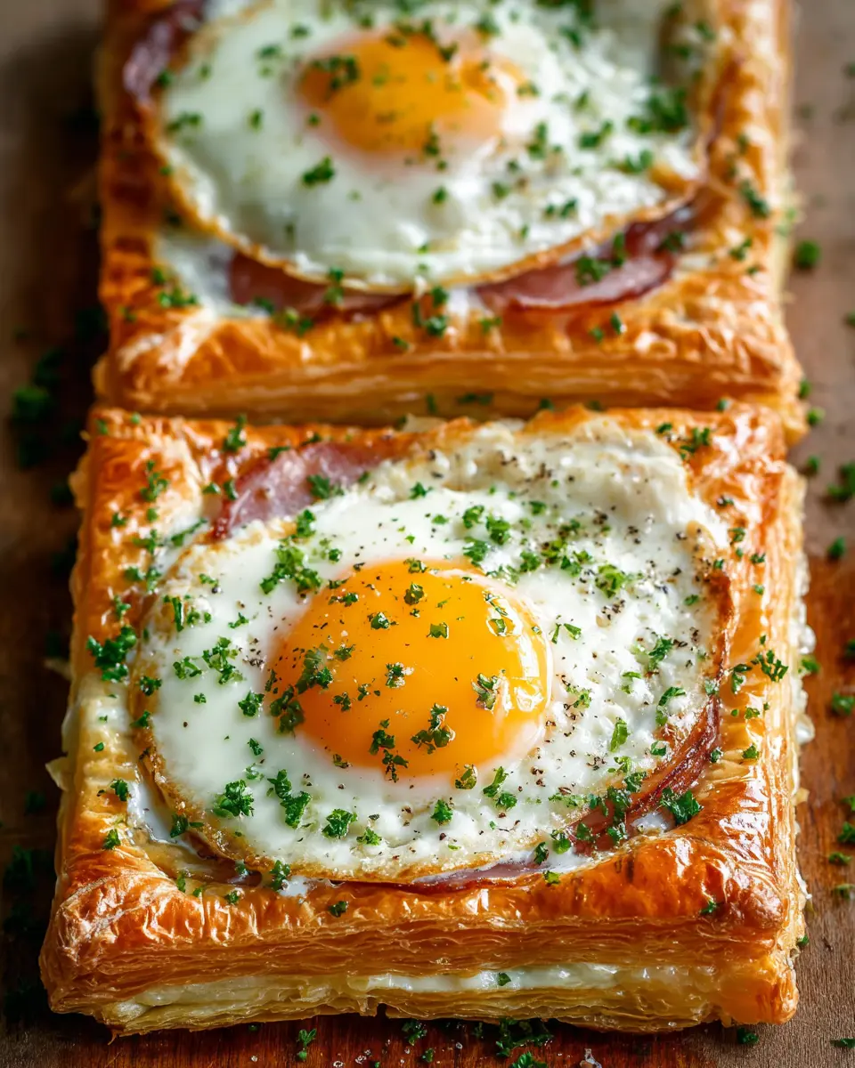 Pop the puff pastry croque madame back in the oven for another 10 minutes. You’re looking for the egg whites to be set while the yolks remain gloriously runny, creating that perfect balance of textures. Once they’re done, you can garnish your croque madame with freshly chopped chives and serve warm. This dish combines comfort and sophistication—ideal for brunch with friends or a delightful breakfast on a cozy Sunday morning. Enjoy!