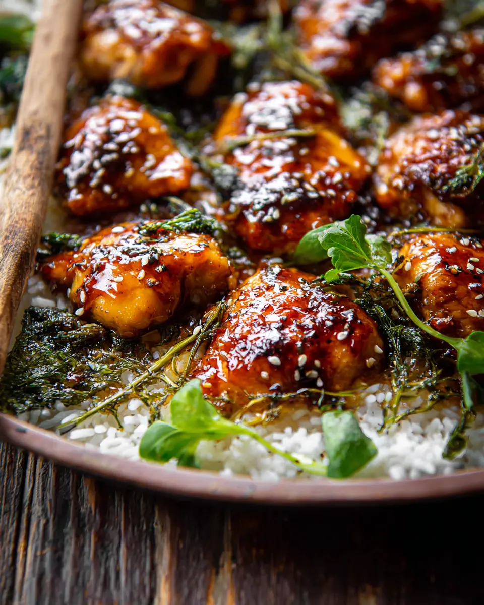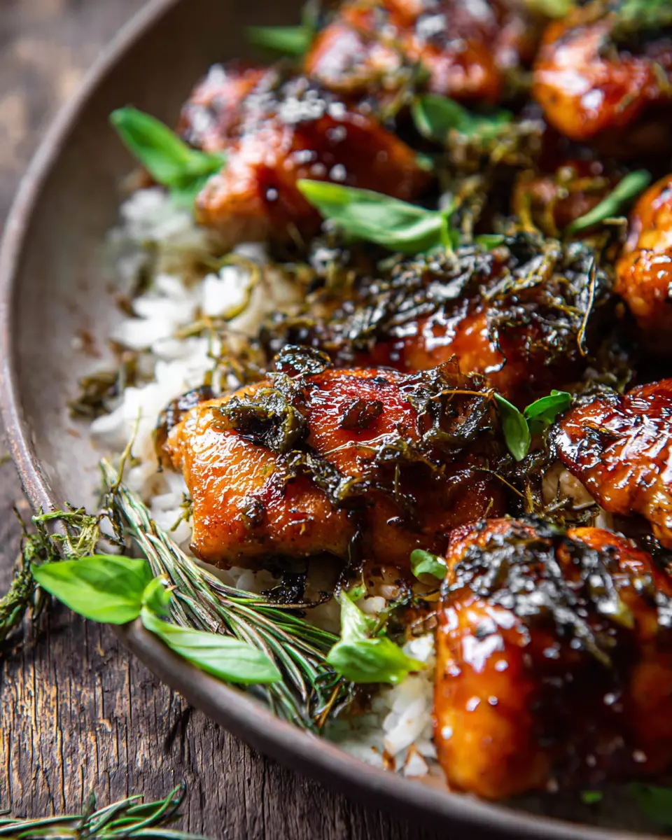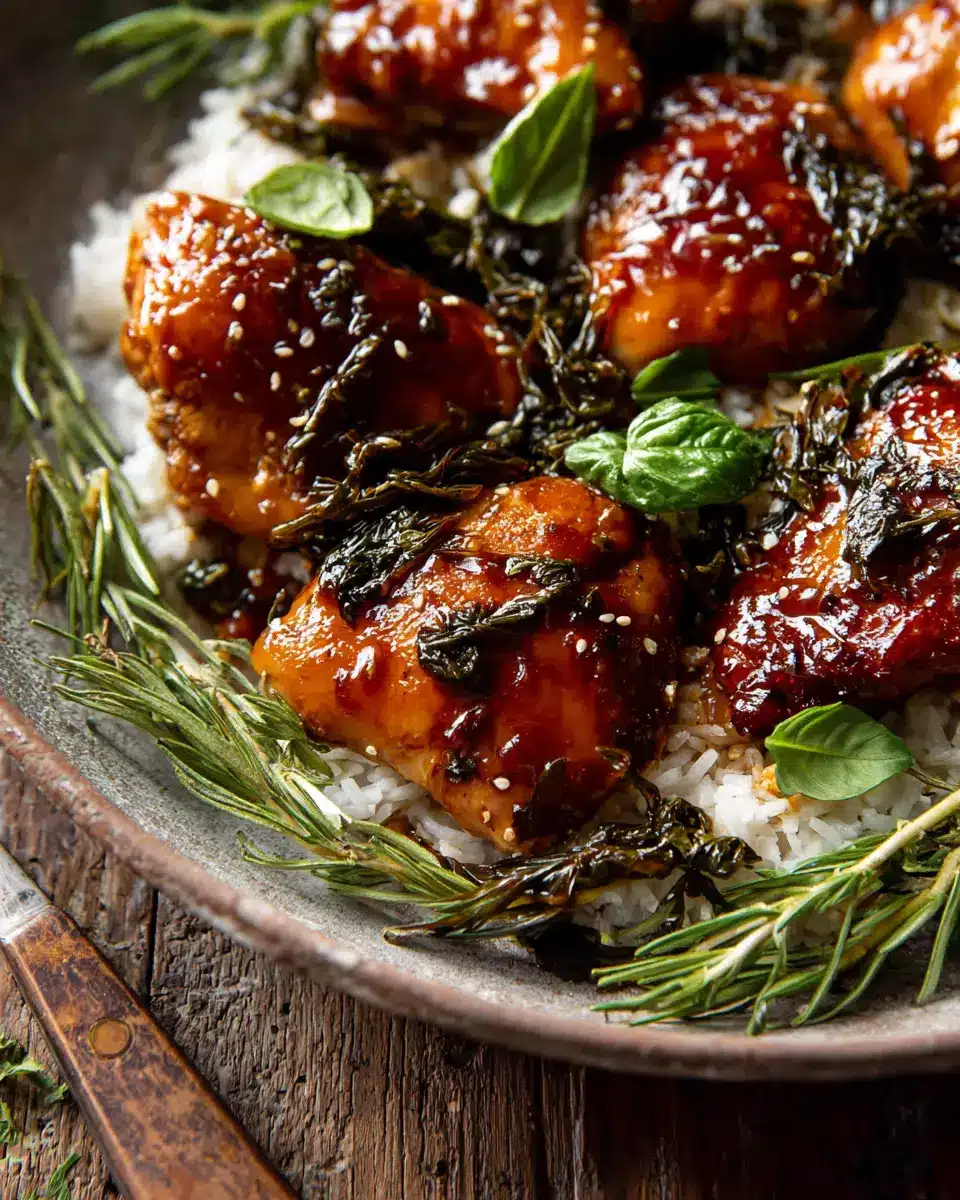Finally, serve your flavorful sheet pan sticky apricot chicken over a bed of fluffy rice. This dish pairs wonderfully with coconut rice if you want to add a tropical flair. Sprinkle fresh basil leaves and sesame seeds on top to add a delightful crunch and burst of flavor. Enjoy!