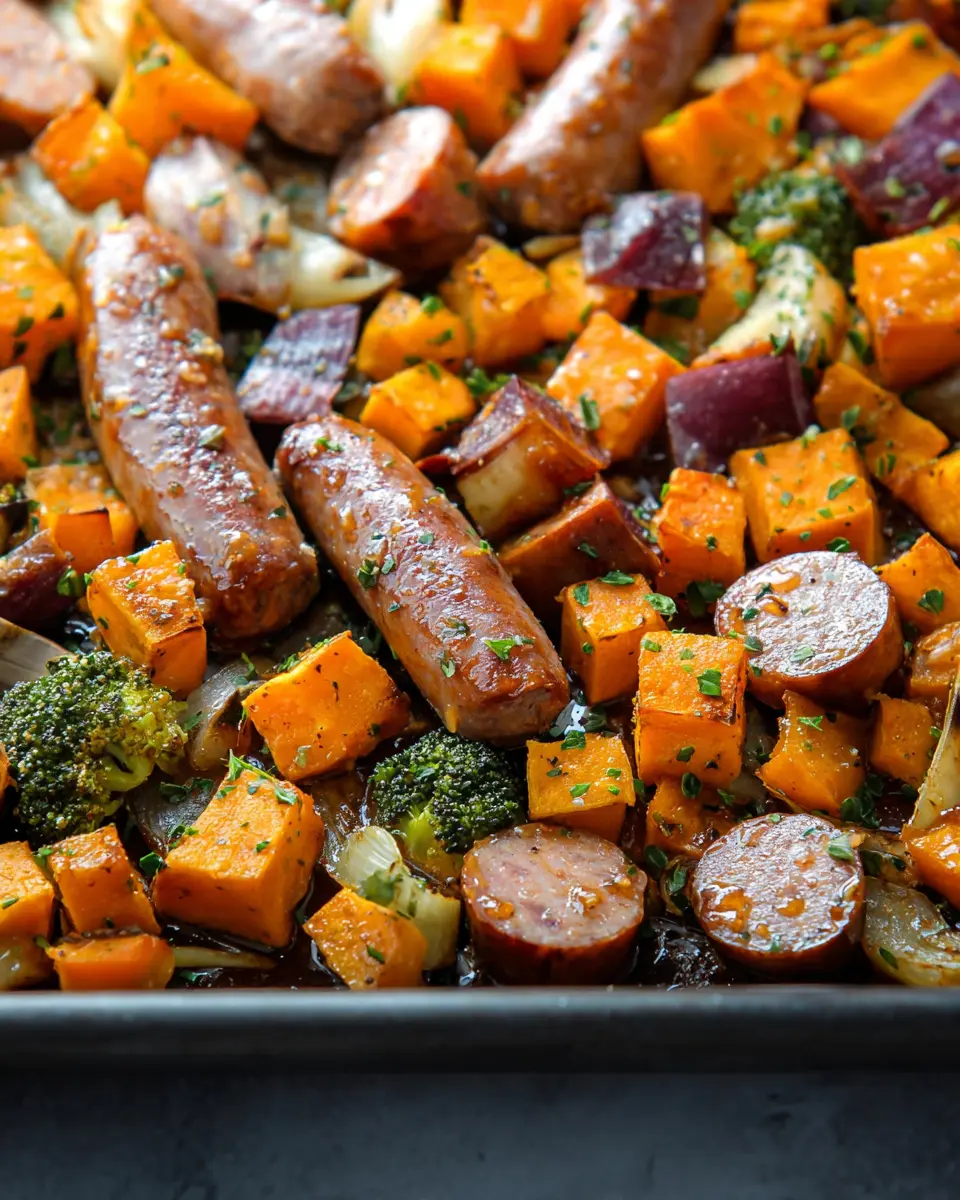 Sheet Pan Sausage and Sweet Potatoes with Honey Garlic Sauce