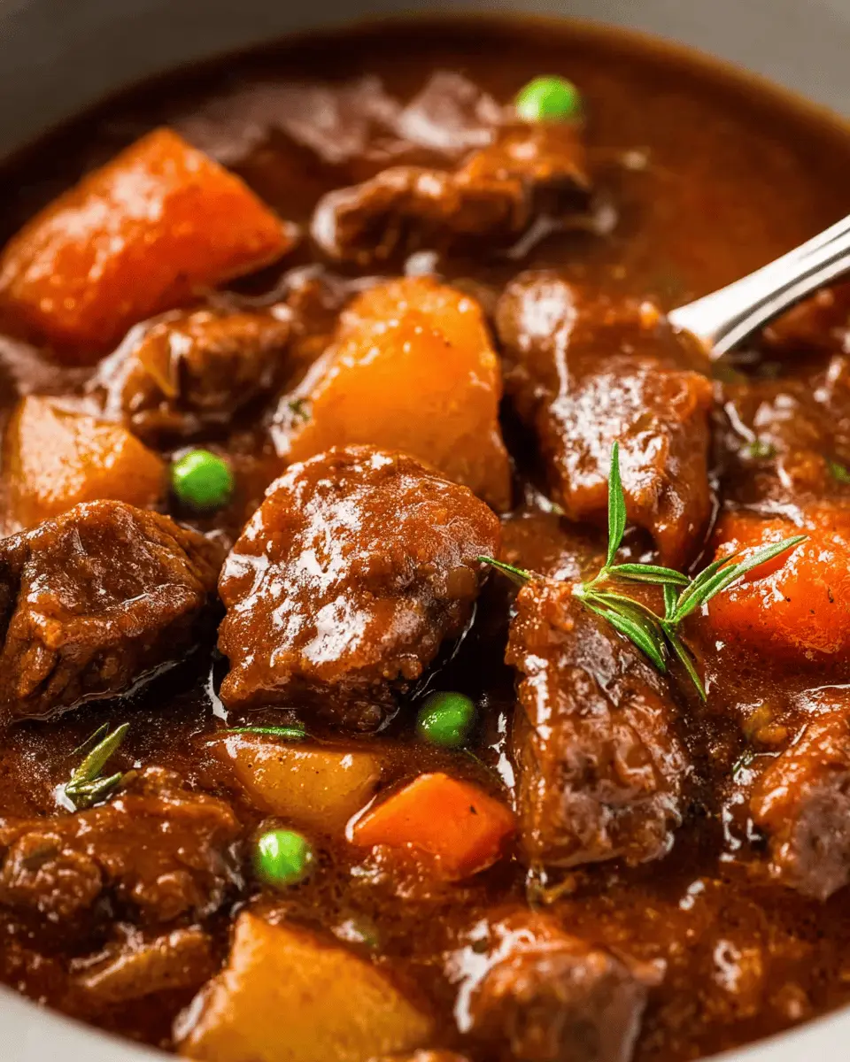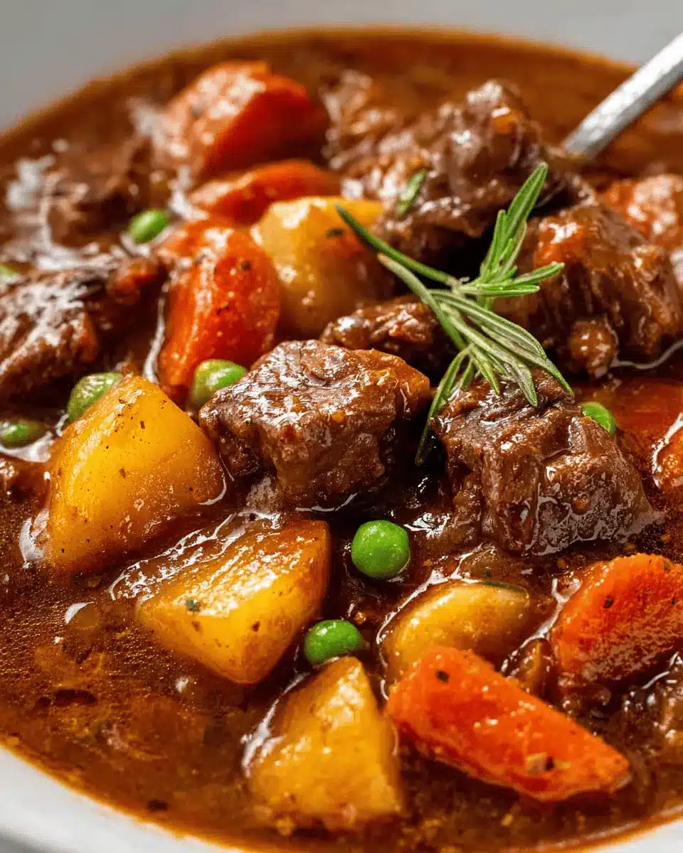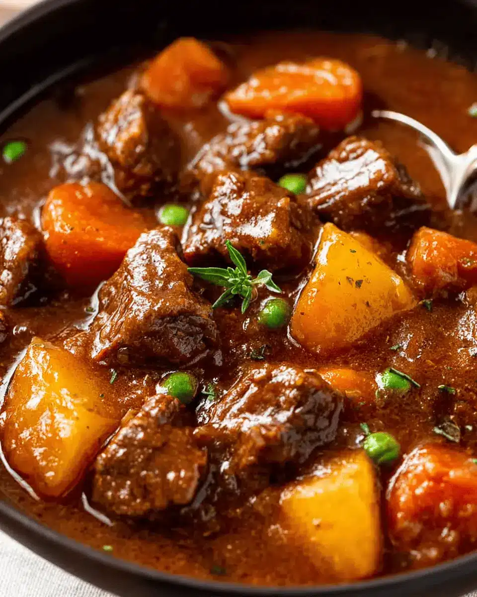 Just before serving, add those frozen peas to bring a pop of color and freshness. If you prefer a thicker texture, mix ¼ cup of cold water with 3 tablespoons of cornstarch, adding it slowly to the stew and stirring until well incorporated. Finish with a swirl of 2 tablespoons of cold butter for that velvety touch. Optional: A few drops of Gravy Master can also deepen the color and flavor.