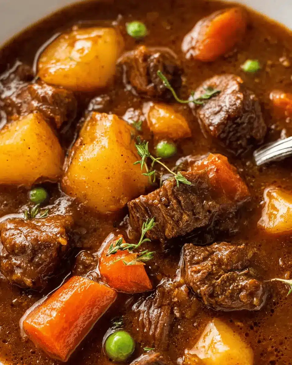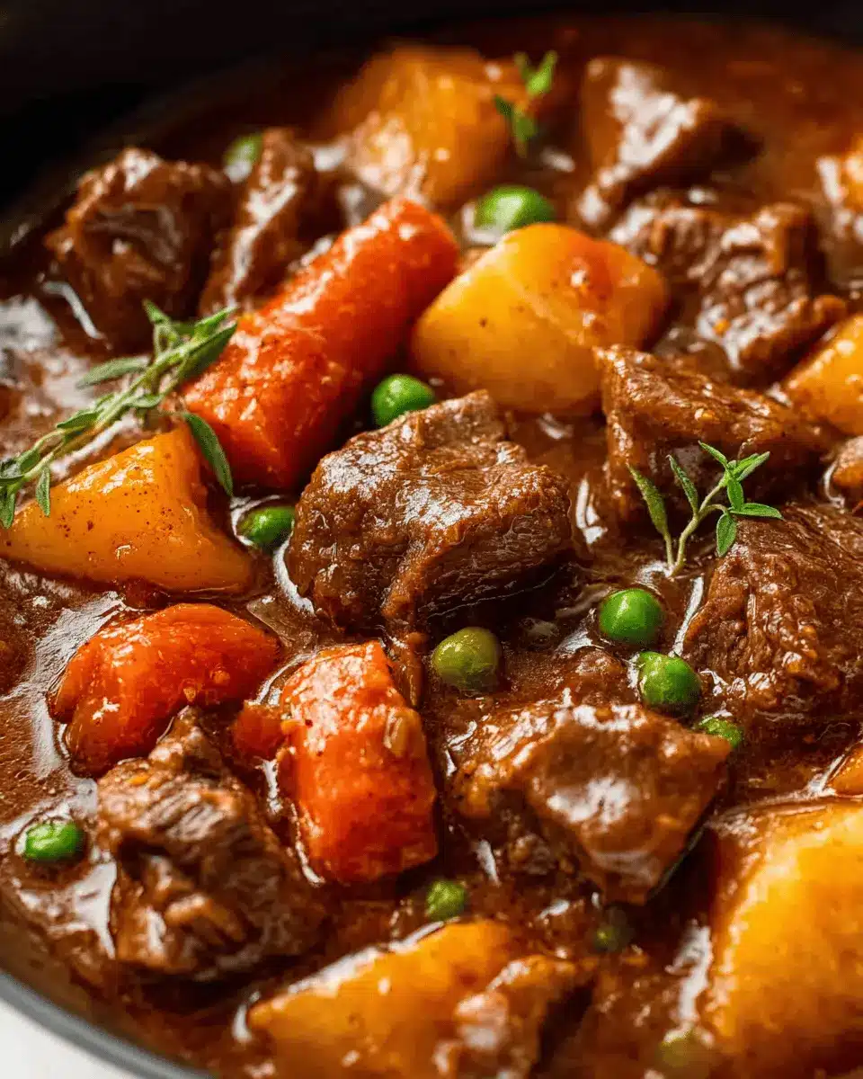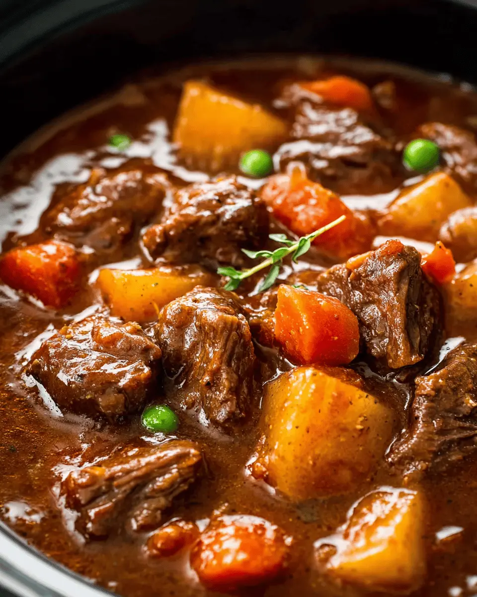 Finally, set your slow cooker on low for about 7 to 8 hours or high for 3.5 to 4 hours. During this time, your kitchen will fill with an enticing aroma that makes all the waiting worthwhile. About 15 minutes before serving, toss in the frozen peas to add a burst of color and sweetness. If you want to thicken your stew, now’s the time to mix some cornstarch with cold water and stir it in.