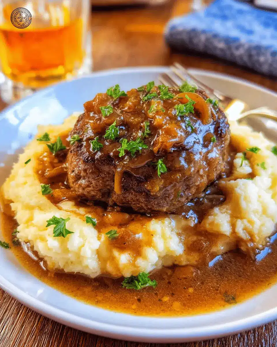 When ready, carefully place the patties on a serving plate. To thicken the gravy, transfer it to a saucepan, bring it to a simmer, and add a cornstarch slurry made with 2 tablespoons of cornstarch and a little water. Simmer until it thickens, then pour it over the patties for that final touch.