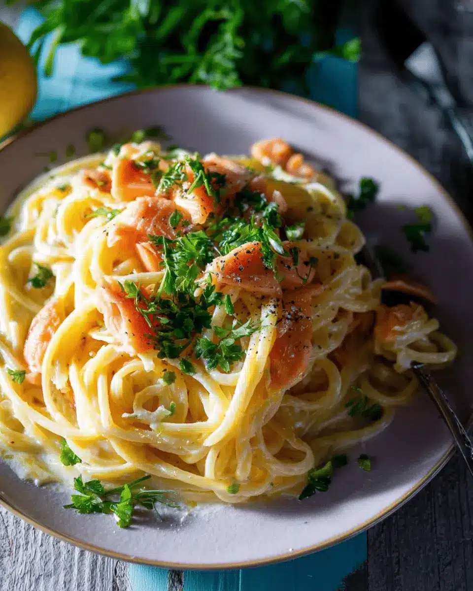 Plate your creation, garnishing with chopped parsley and a burst of black pepper. The smoked salmon pasta carbonara is ready to impress! Enjoy every delightful bite of this creamy, savory dish that’s perfect for a weeknight dinner or a special occasion.