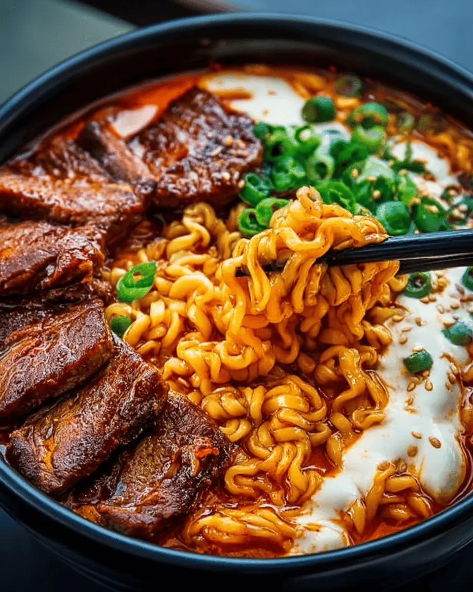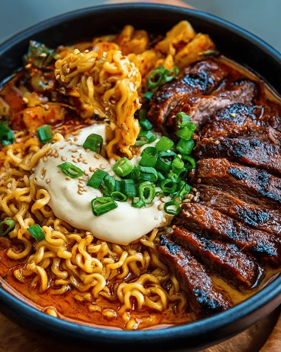 If you’re craving a deliciously spicy Korean ramen experience, this dish is your ticket! The rich flavors of grilled beef combined with the creamy sauce elevate instant noodles to a whole new level. Enjoy this comforting meal any night of the week and impress your friends with your culinary skills!