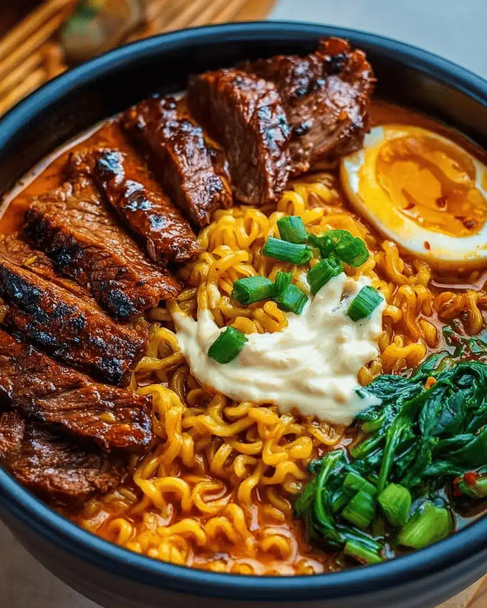 - Assemble bowls: add noodles and broth, top with creamy sauce, grilled beef, green onions, sesame seeds, and extra spice if desired.