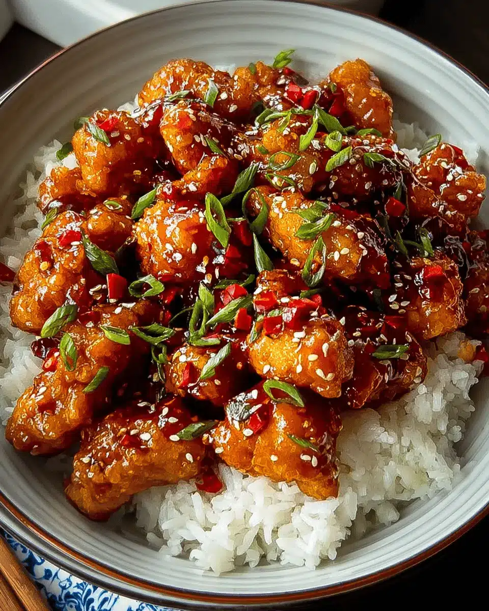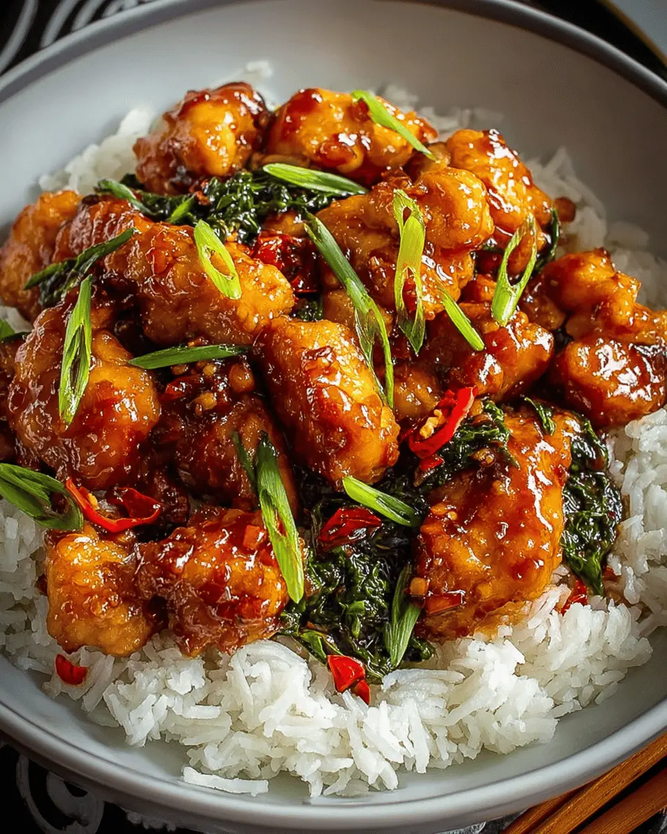 - Plate the chicken, garnish with green onions and sesame seeds, and serve over rice or noodles.