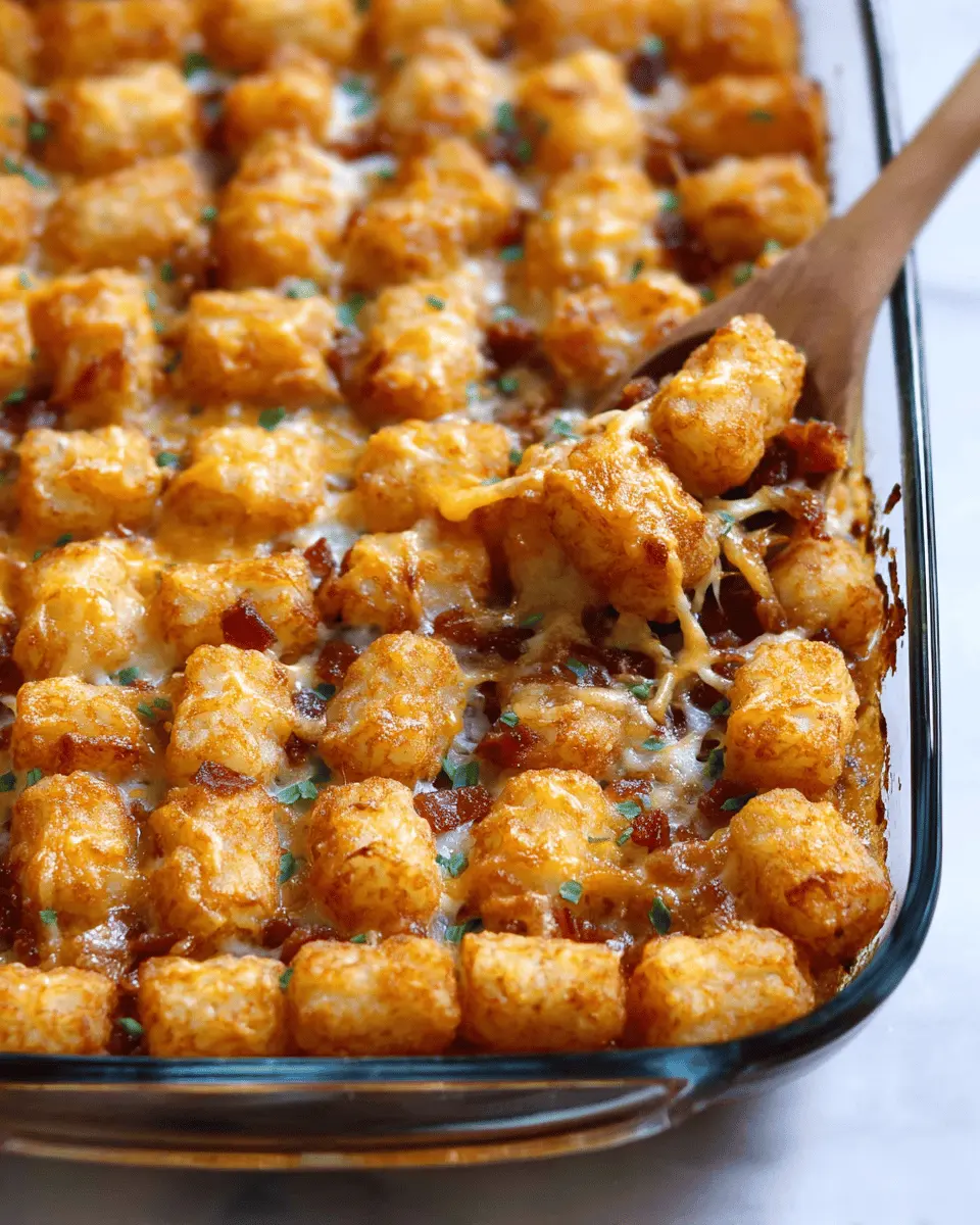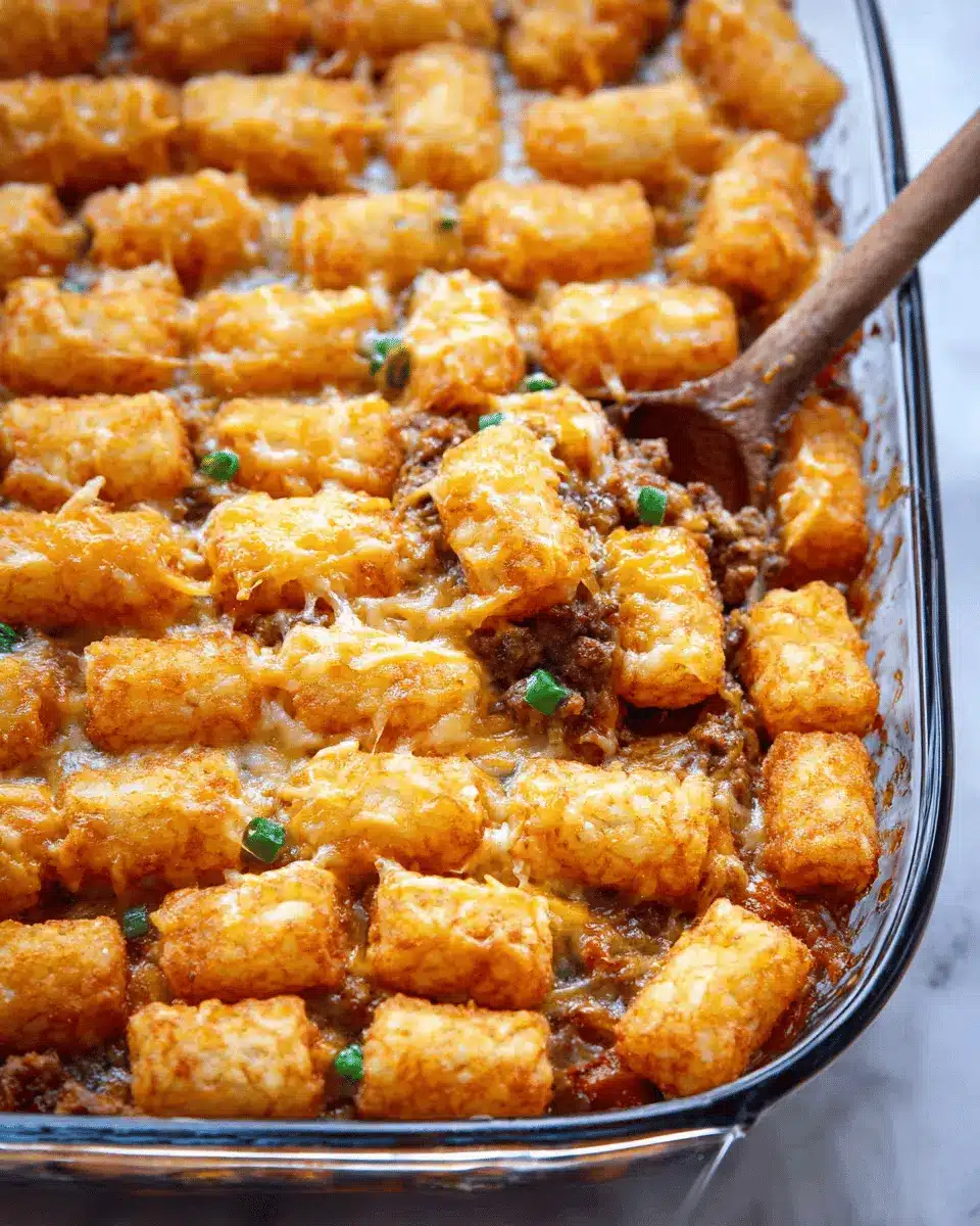 Once it’s done, let it cool for a few minutes before serving. Add a sprinkle of chives or green onions if you like, and enjoy your easy, comforting, and absolutely delicious Tater Tot Casserole—a dish that feels like a warm hug after a long day!