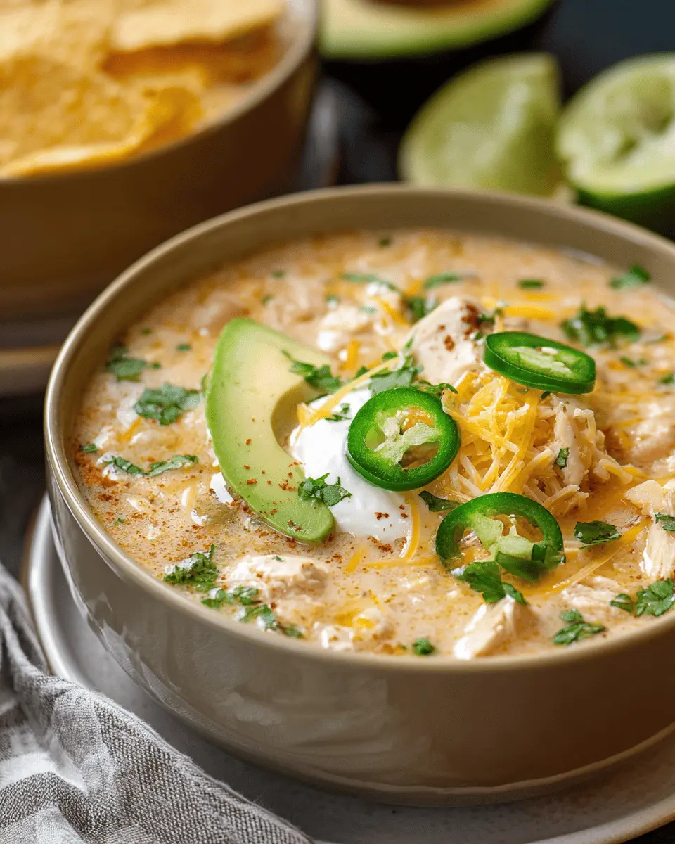 Wondering how to spice things up? Feel free to serve the best white chicken chili with Monterey Jack cheese, avocado slices, and crunchy tortilla chips for added flavor and texture. Happy cooking!